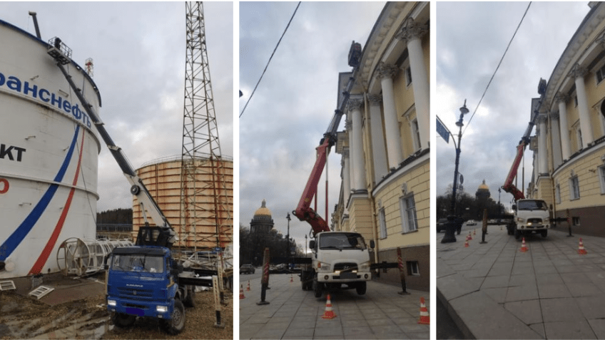 Вторая работа о которой хочется сказать пару слов это – замена фонарей фасадного освещения на здании Конституционного Суда РФ. Техника подбиралась по строжайшим критериям, и наша машина им полностью соответствовала. Работа проведена быстро и качественно.
